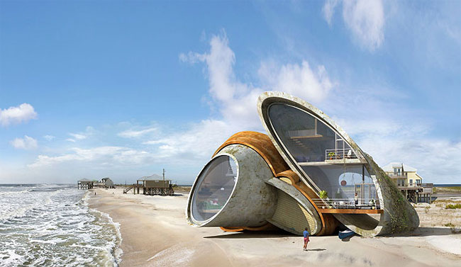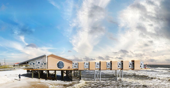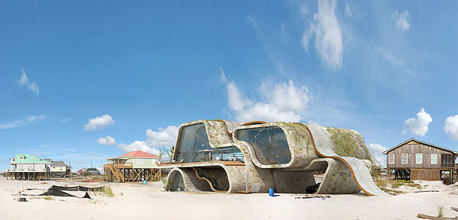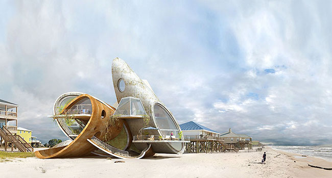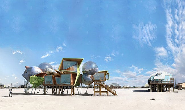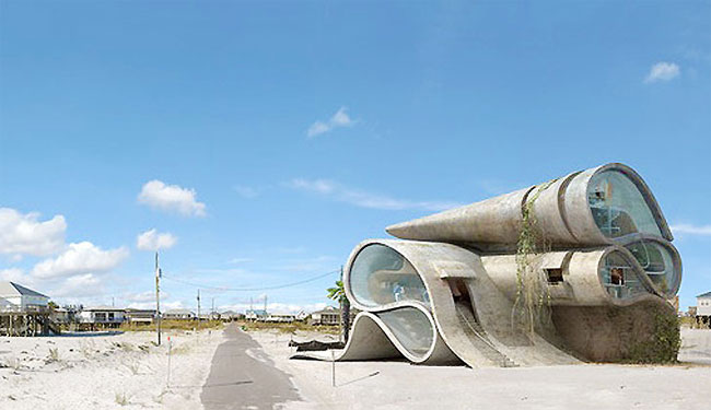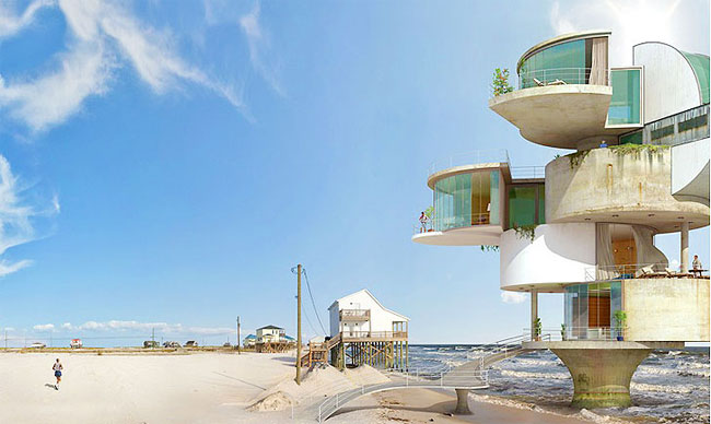 The design is called “Dauphin Island” and the structrires are hybrids of beach-houses, bunkers and space ships.