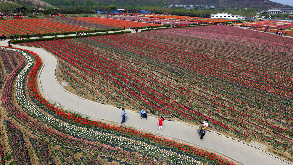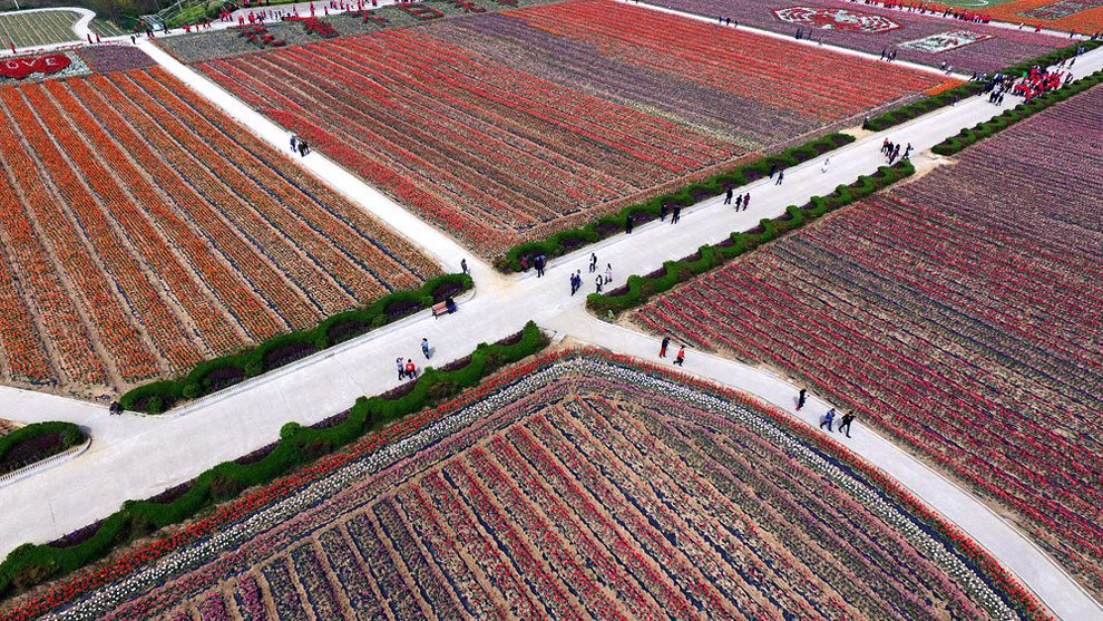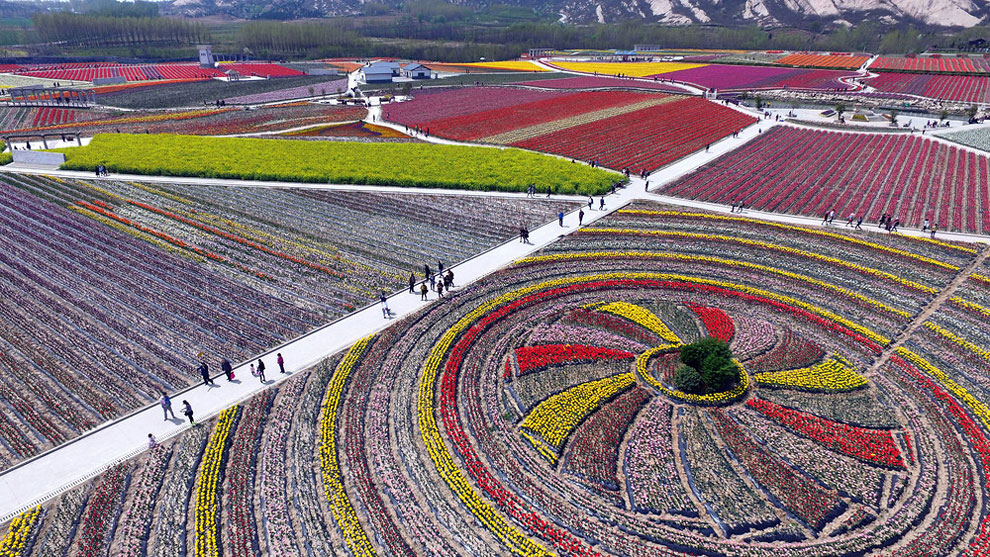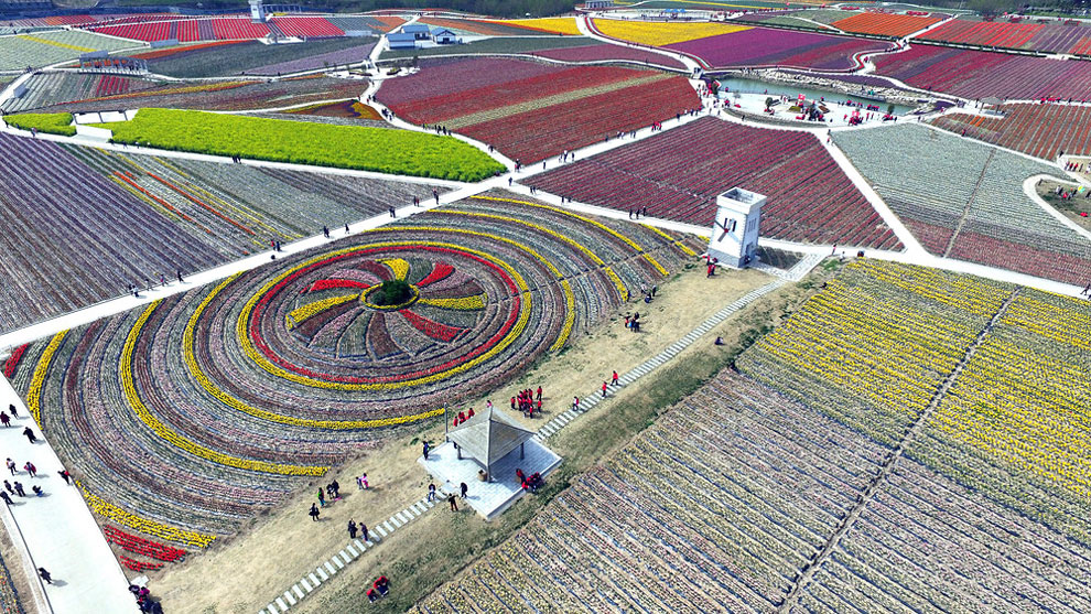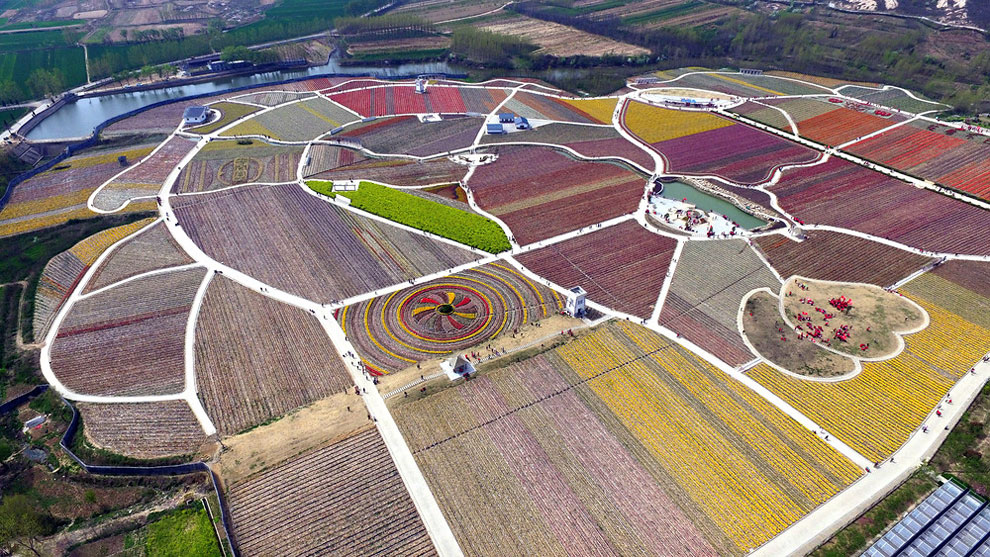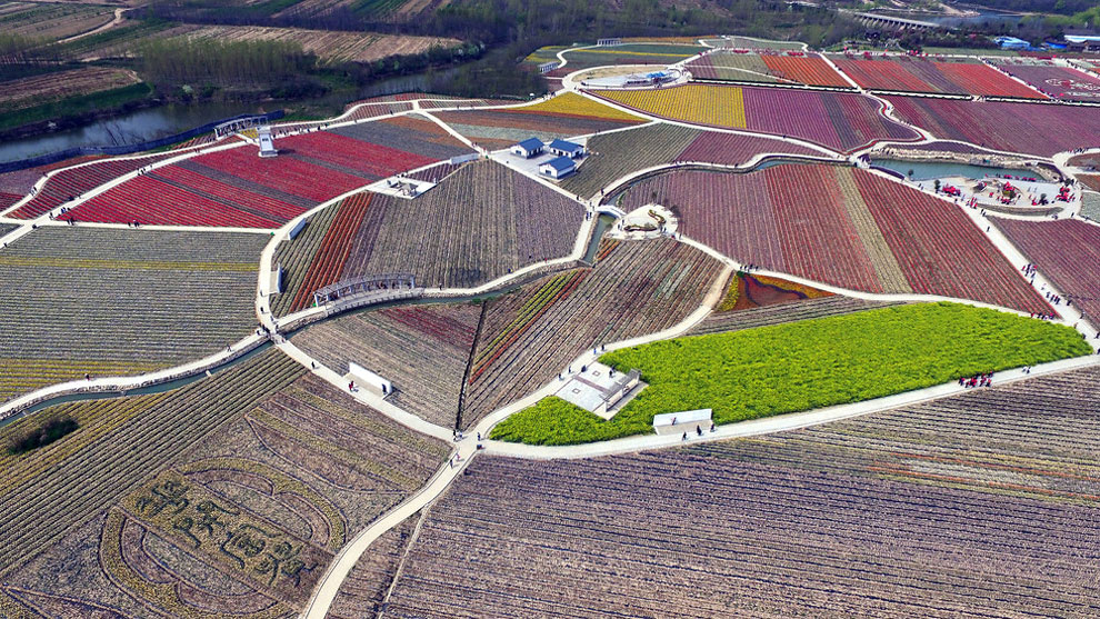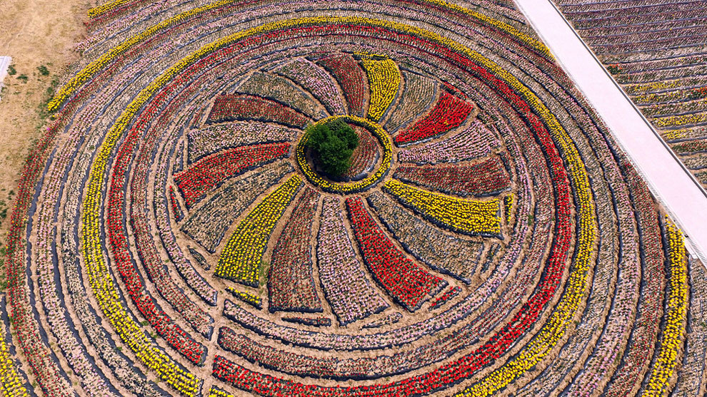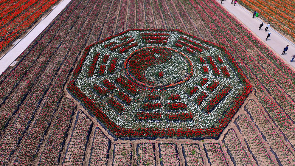 Now when it gets warm, China’s tulip farms are a MUST see. Most of the Chinese farmers enjoy their time with the flowers while , creating intricate designs like swirls, zig-zags and even a ying and yang symbol. The colorfoul designs are perfect when you see them but from above the panorama is something unique.