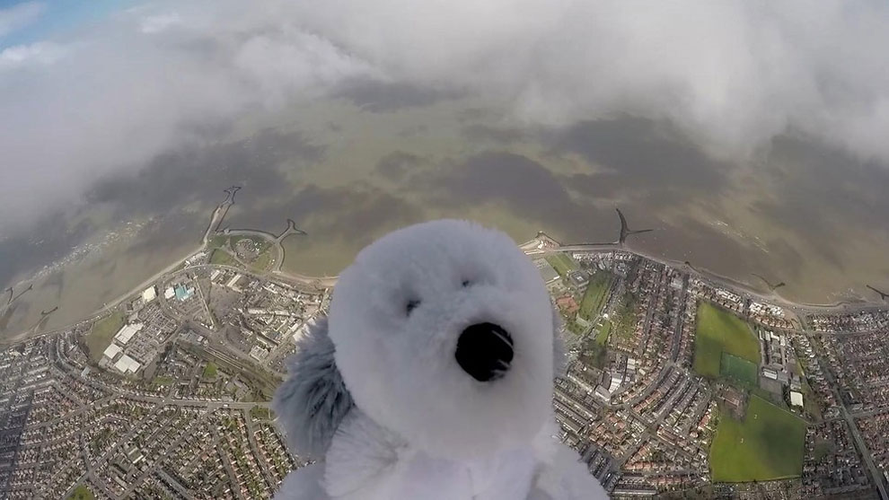 In Morecambe in northwest England, both teachers and pupils at an elementary school strapped the white fluffy school mascot to a high-altitude helium balloon and did launch him from a hotel roof. After rising up for a while the balloon burst and our little Sam disappeared (they found the camera and the GPS but no sign of our Sam 🙁 ).