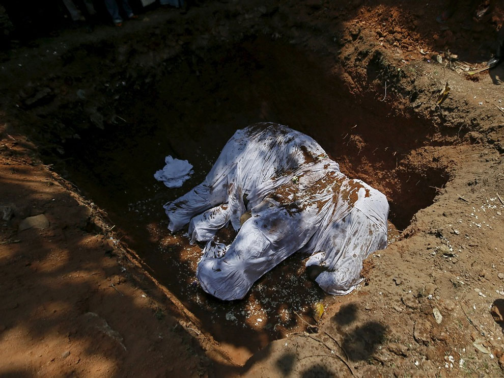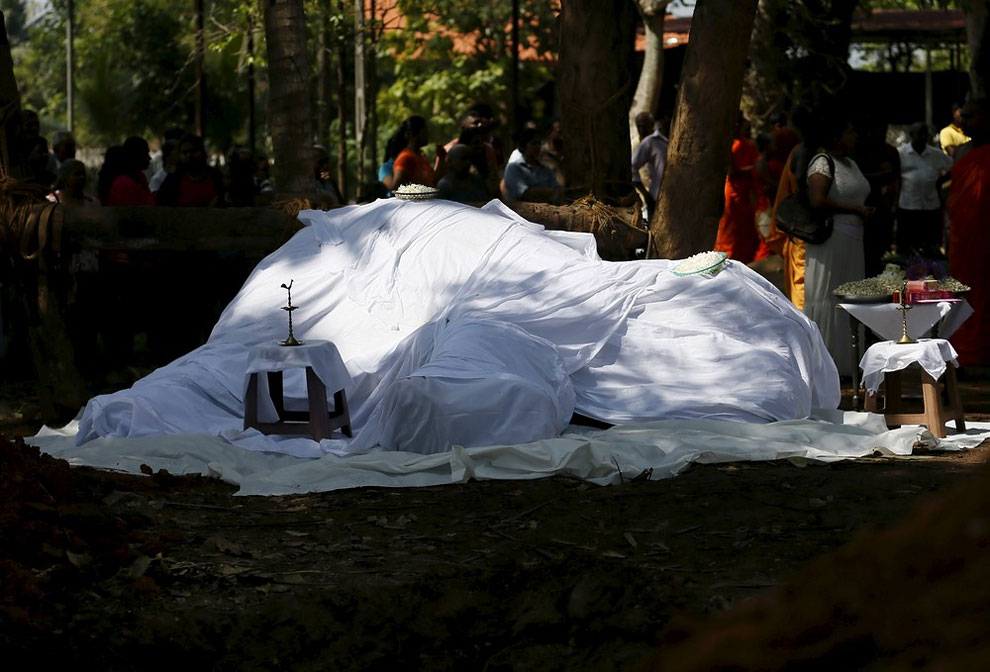 Local villagers prepare to bury the body of elephant Hemantha during a religious ceremony at a Buddhist temple in Colombo March 15, 2016.