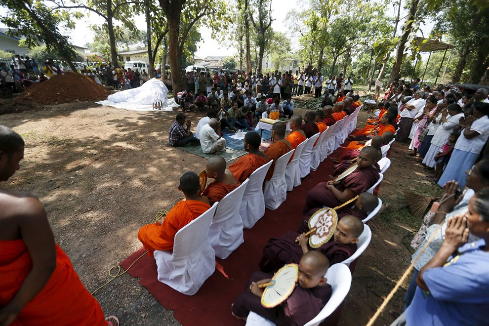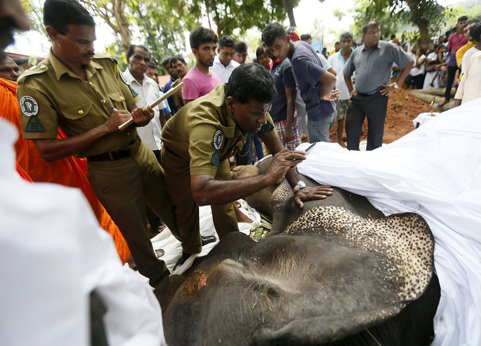 Buddhist monks stand next to elephant Hemantha’s dead body during a religious ceremony at a Buddhist temple in Colombo March 15, 2016.