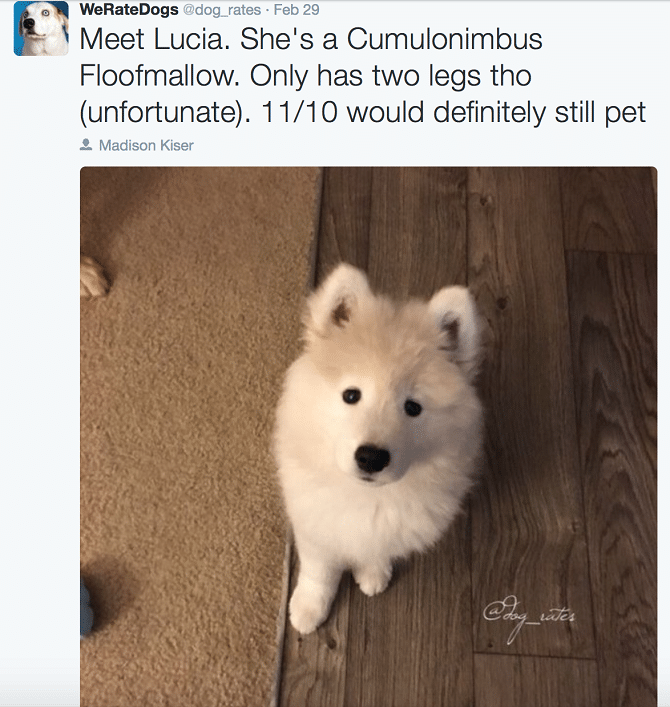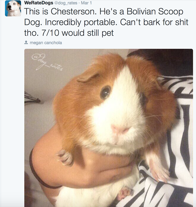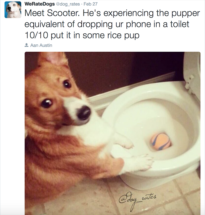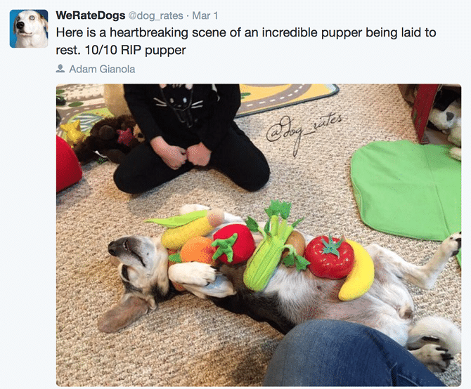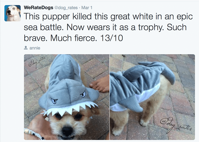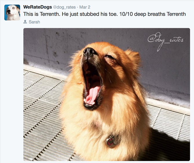 Are you ready to have your dog rated? This comedic Twitter account called WeRateDogs does just that. They receive photos of dogs from their followers and they add funny quotes and captions on top of them rating the dog in question.