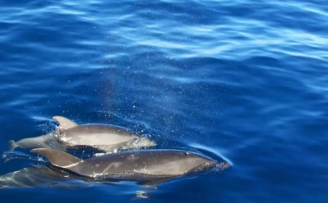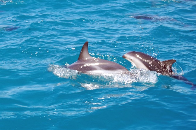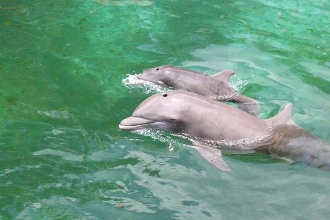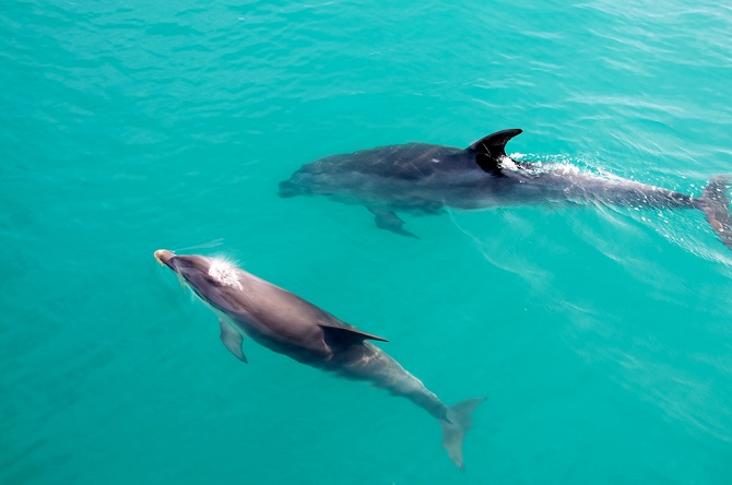 Dolphins as you may know are mammals thus, they can stay underwater for limited time and always need to surface to breathe. There are many different species and most of them prefer warm waters. Their babies which are commonly called calves, stay with their mothers for 3 to 6 years.