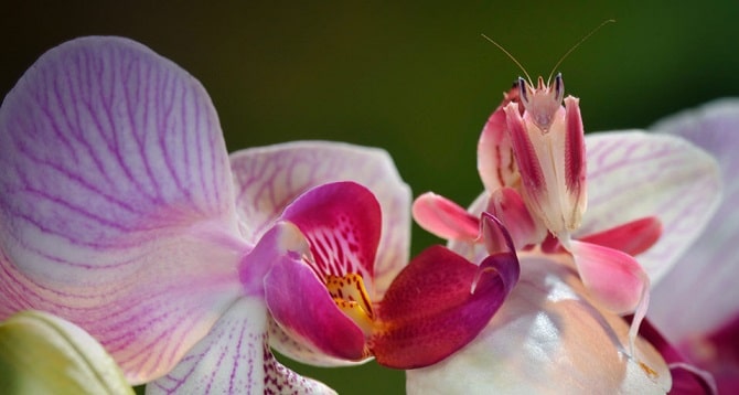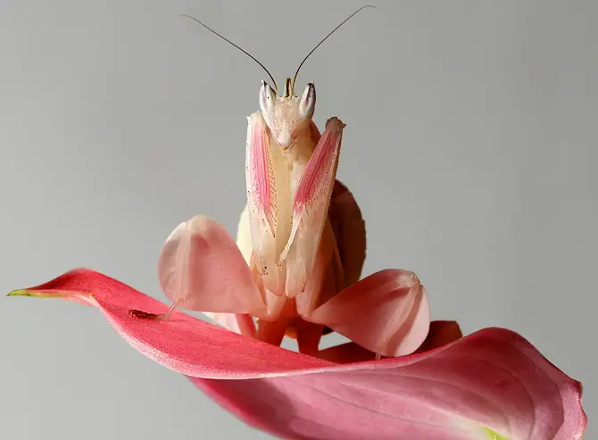 Another unique feature is that Orchid Mantises can camouflage into different colours to mix with their surrounding.
