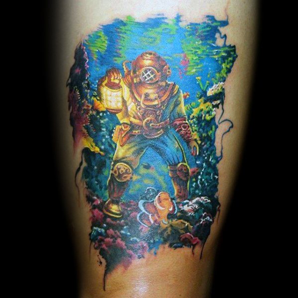 thigh-colorful-underwater-deep-sea-diver-tattoo-ideas-for-males