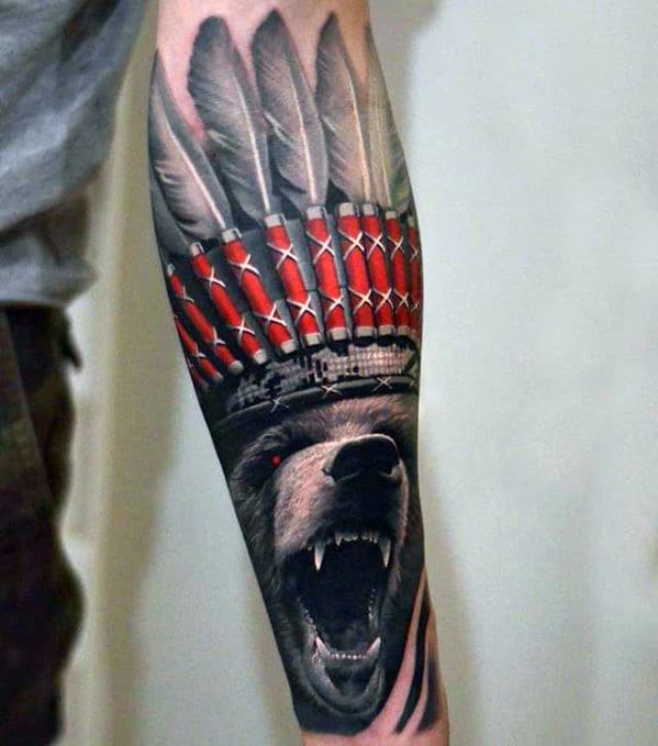 guys-roaring-bear-with-native-american-feather-head-hyper-realistic-forearm-tattoo