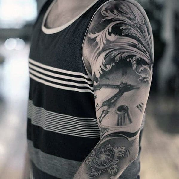 hyper-realistic-ornate-roman-numeral-clock-mens-sleeve-tattoo