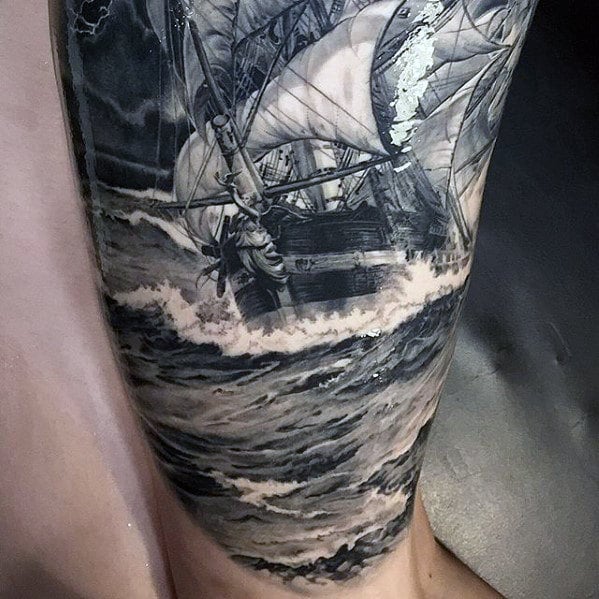 mens-hyper-realistic-boat-sailing-on-ocean-waves-sleeve-tattoo
