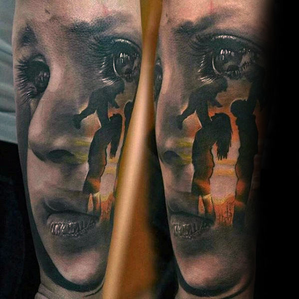 skull-3d-guys-hyper-realistic-forearm-sleeve-tattoo-ideas