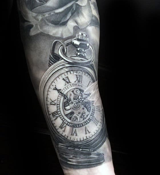 pocket-watch-hyper-realistic-mens-arm-tattoo